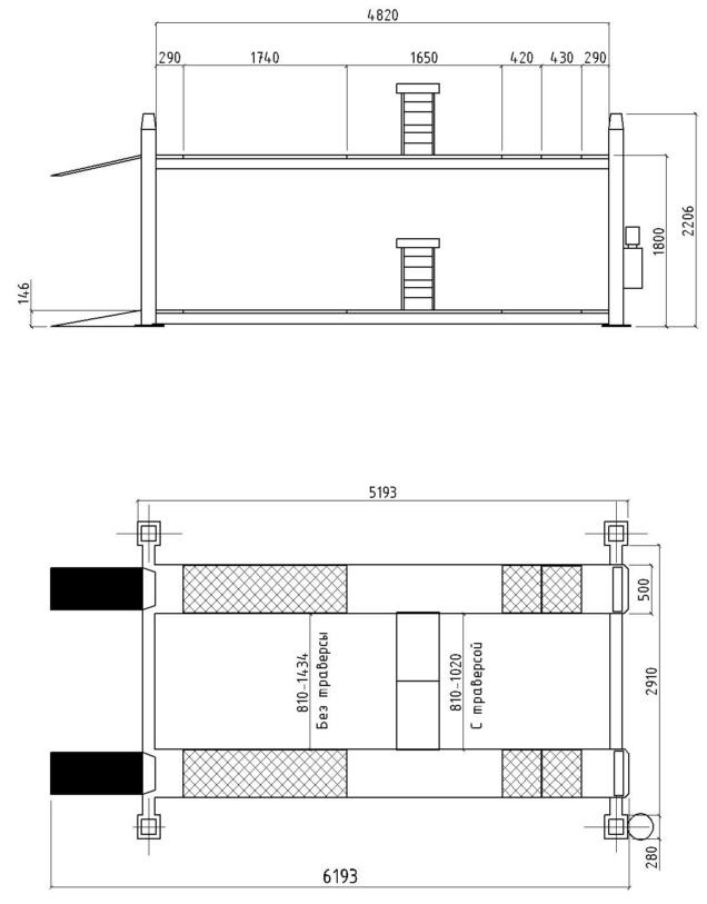1 место (подъемник) 5300х550х700 мм, 1350 кг.