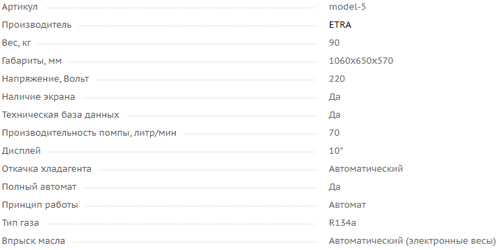 В ETRA™ Model 5 установлены точные электронные весы, по которым с минимальной погрешностью рассчитывается необходимое количество хладагента и масла для заправки.